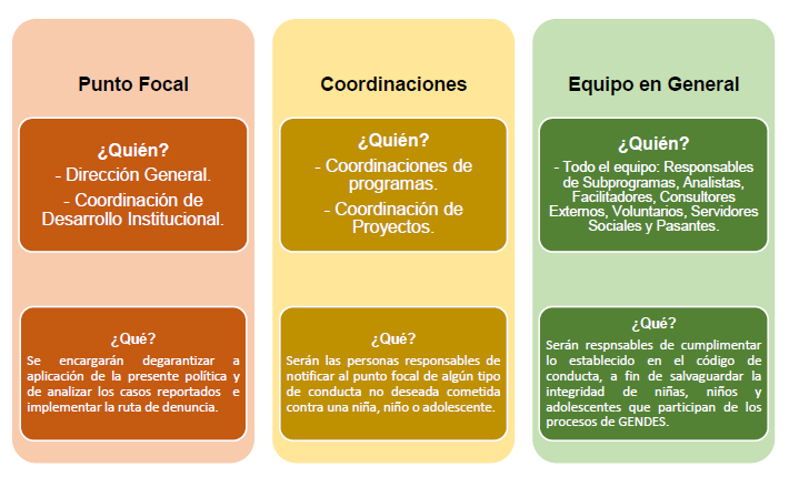 Todos los integrantes del equipo de GENDES debe saber que es deber y responsabilidad mantener y procurar la salvaguarda de las niñas, niños y adolescentes para tal caso deberán atender lo previsto en el código de conducta. Partiendo de la premisa de que todas las personas somos responsables de la salvaguarda e integridad de las niñas, niños y adolescentes se muestra a continuación un diagrama de responsabilidades: